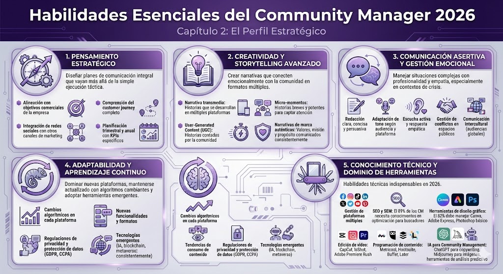 El Community Manager de 2026 es un profesional sofisticado que combina creatividad, análisis de datos, pensamiento estratégico y empatía humana. Este rol ha evolucionado de una posición operativa a una función estratégica esencial que impacta directamente en el ROI empresarial.
