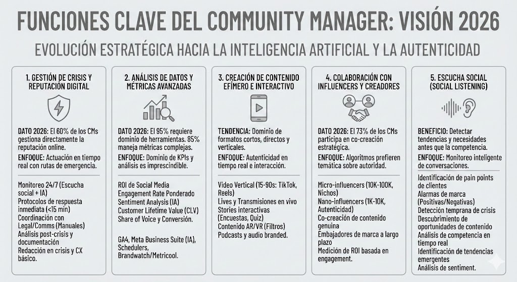 En 2026, este profesional se ha consolidado como una pieza estratégica fundamental: arquitecto de comunidades, analista de datos, estratega de marca y gestor de reputación digital. Su misión es construir relaciones auténticas y sostenibles en un ecosistema digital cada vez más complejo y tecnológicamente avanzado.