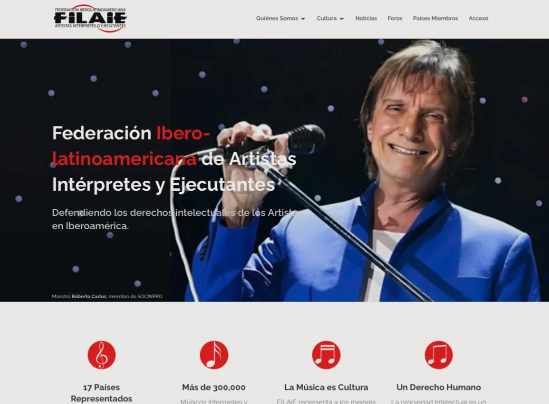 La web de filaie.org representa a la Federación Ibero-Latinoamericana de Artistas Intérpretes y Ejecutantes, una organización dedicada a la defensa de los derechos intelectuales de los artistas en Iberoamérica.
